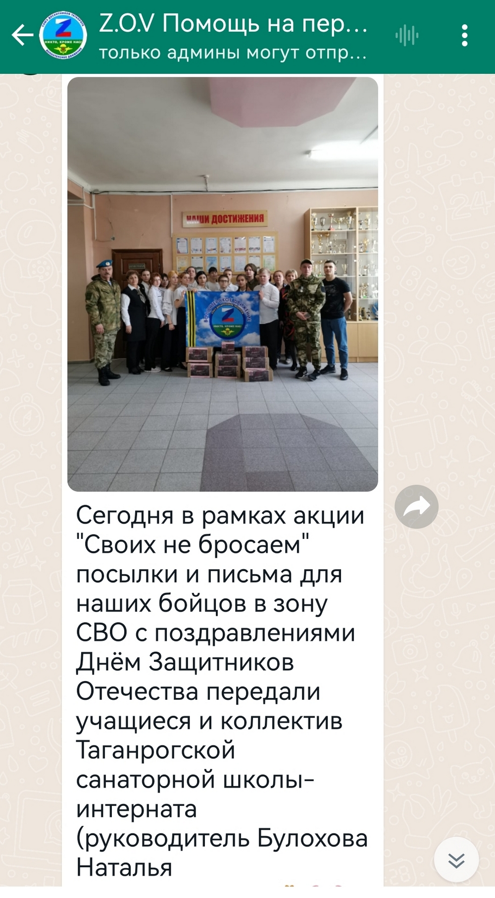 20 февраля 2024 года в рамках акции «Своих не бросаем» и декады военно-патриотической работы «На страже мира и добра» учащиеся и коллектив Таганрогского филиала ГКОУ РО «Ростовская-на-Дону санаторная школа-интернат № 74» передали поздравления с наступающим праздником «День Защитника Отечества» и подарки бойцам в зону специальной военной операции на Украине.