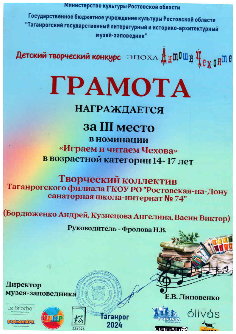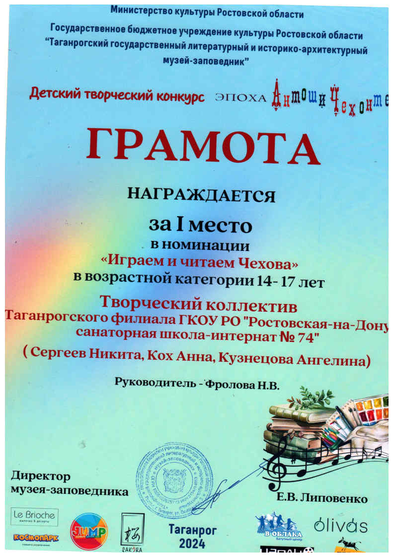 Вот уже десятый год Таганрогский государственный литературный и историко-архитектурный музей-заповедник проводит Региональный детский творческий конкурс «Эпоха Антоши Чехонте». Традиционно в этом конкурсе принимает участие Студия театральных миниатюр «Подмостки» (руководитель Фролова Н.В.) Таганрогского филиала ГКОУ РО «Ростовская-на-Дону санаторная школа-интернат № 74» в номинации «Играем и читаем Чехова». В этом году на суд компетентного жюри были представлены две работы нашего коллектива. 3 место заняла театрализация рассказа «Злой мальчик», участники – Бордюженко Андрей, Кузнецова Ангелина и Васин Витя и 1 место – театрализация рассказа «Тёща-адвокат», участники – Сергеев Никита, Кох Анна и Кузнецова Ангелина. Награждение состоялось в литературном музее Чехова, где ребята получили не только дипломы, но и приз – билеты в кинотеатр «Чарли». Желаем творческому коллективу дальнейших успехов и заслуженных побед!