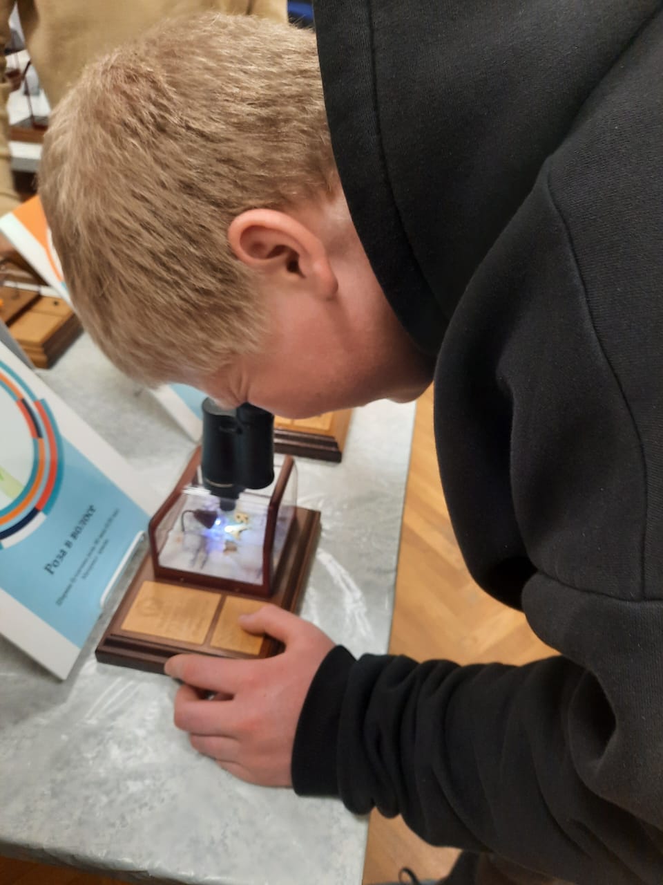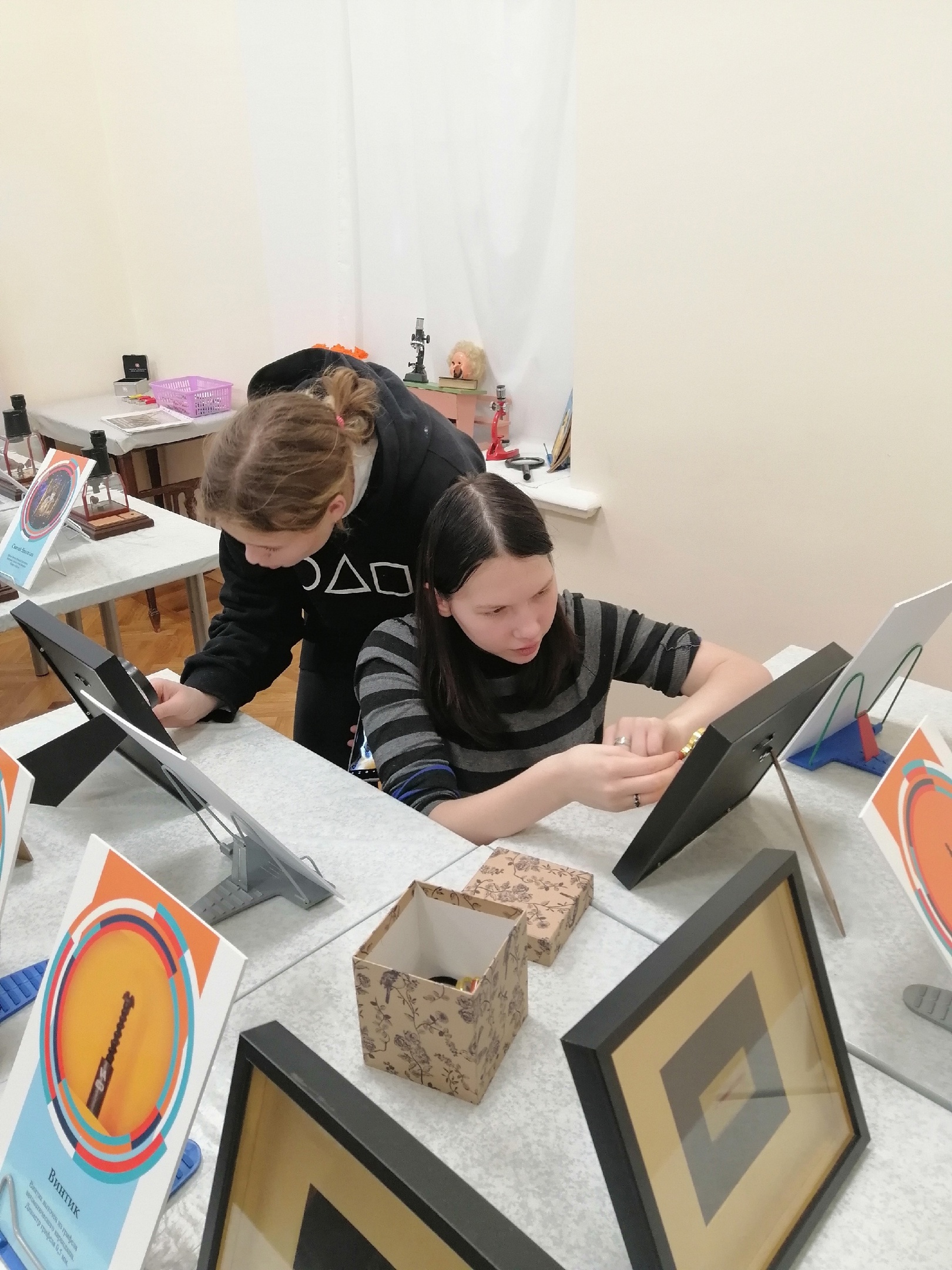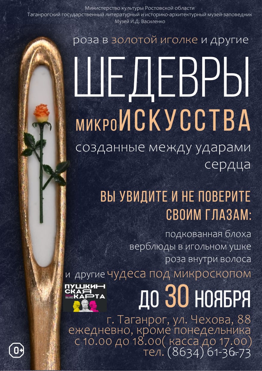 В музее таганрогского писателя И.Д. Василенко разместилась необычная для нашего города выставка. Название «Шедевры микроискусства» говорит само за себя. На выставке были представлены уникальные работы новосибирского мастера микроминиатюр Владимира Анискина. 24 и 29 ноября 2023 года группа старшеклассников Таганрогского филиала ГКОУ РО «Ростовская-на-Дону санаторная школа-интернат № 74» посетила эту удивительную выставку по Пушкинской карте. Ребят привели в восхищение работы, выполненные на срезе макового, рисового зернышек и зернышка яблока. Рассмотреть работы можно было только при помощи увеличительных стекол или под микроскопом. Мальчиков, занимающихся спортом, поразили рисунки символа чемпионата мира по футболу – Забиваки и кубка УЕФА, выполненные на рисовом зерне. Девочкам больше всего понравилась работа «Роза в волосе», выполненная из пыли, которая была размещена в конском волосе.