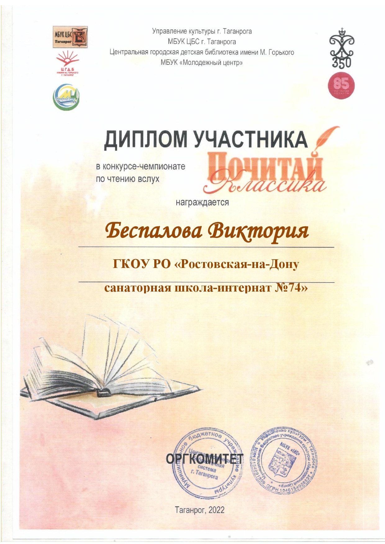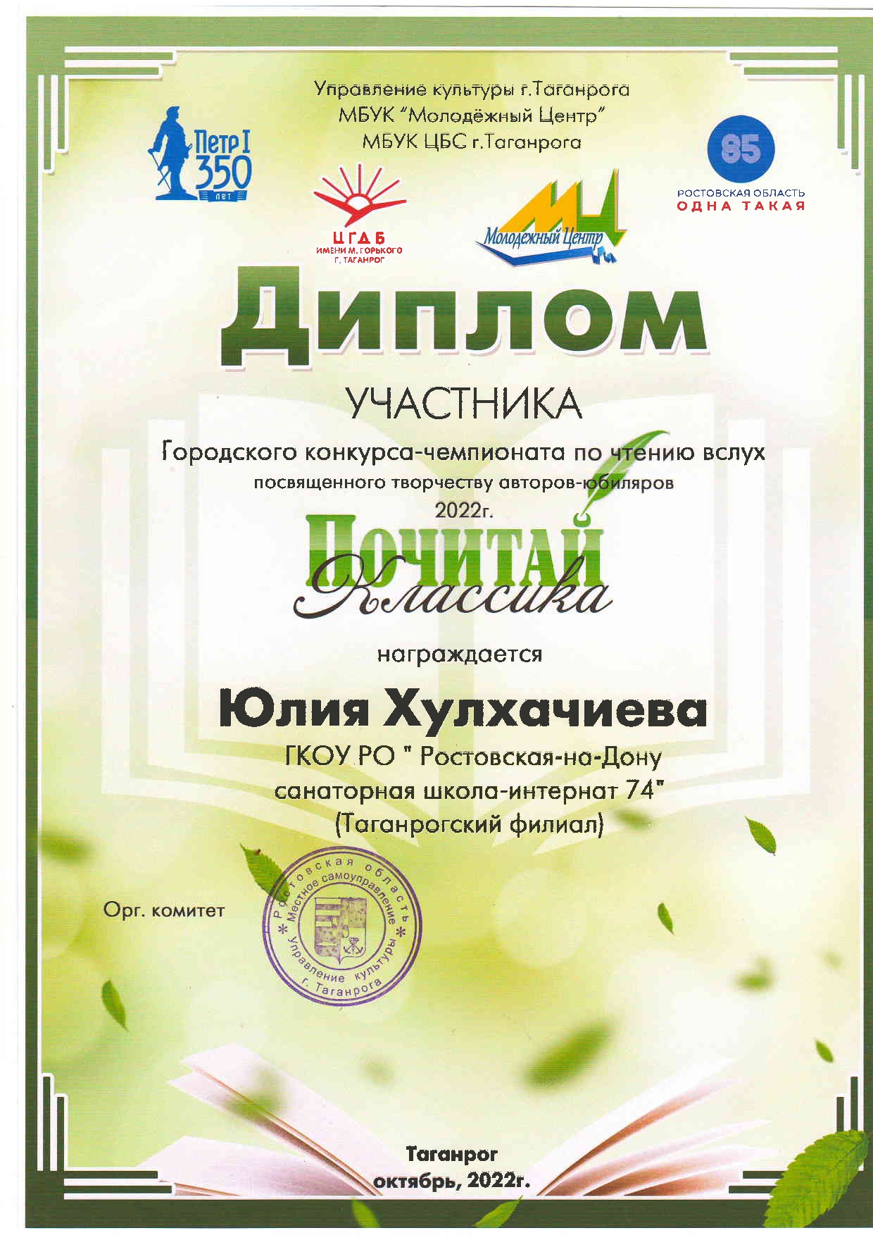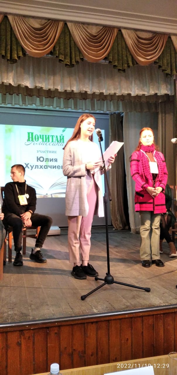 Обучающиеся ГКОУ РО «Ростовская-на-Дону санаторная школа-интернат №74» (Таганрогский филиал) приняли участие в городском конкурсе-чемпионате по чтению вслух «Почитай классика!». Цель чемпионата: популяризация книг, русского языка, литературы и театрального искусства среди молодёжи, посредством выразительного чтения отрывков из литературных произведений. Были прочитаны рассказы, стихотворения и драматические произведения писателей – юбиляров 2022года. Подготовила участников к конкурсу педагог-библиотекарь Яровенко В.М.