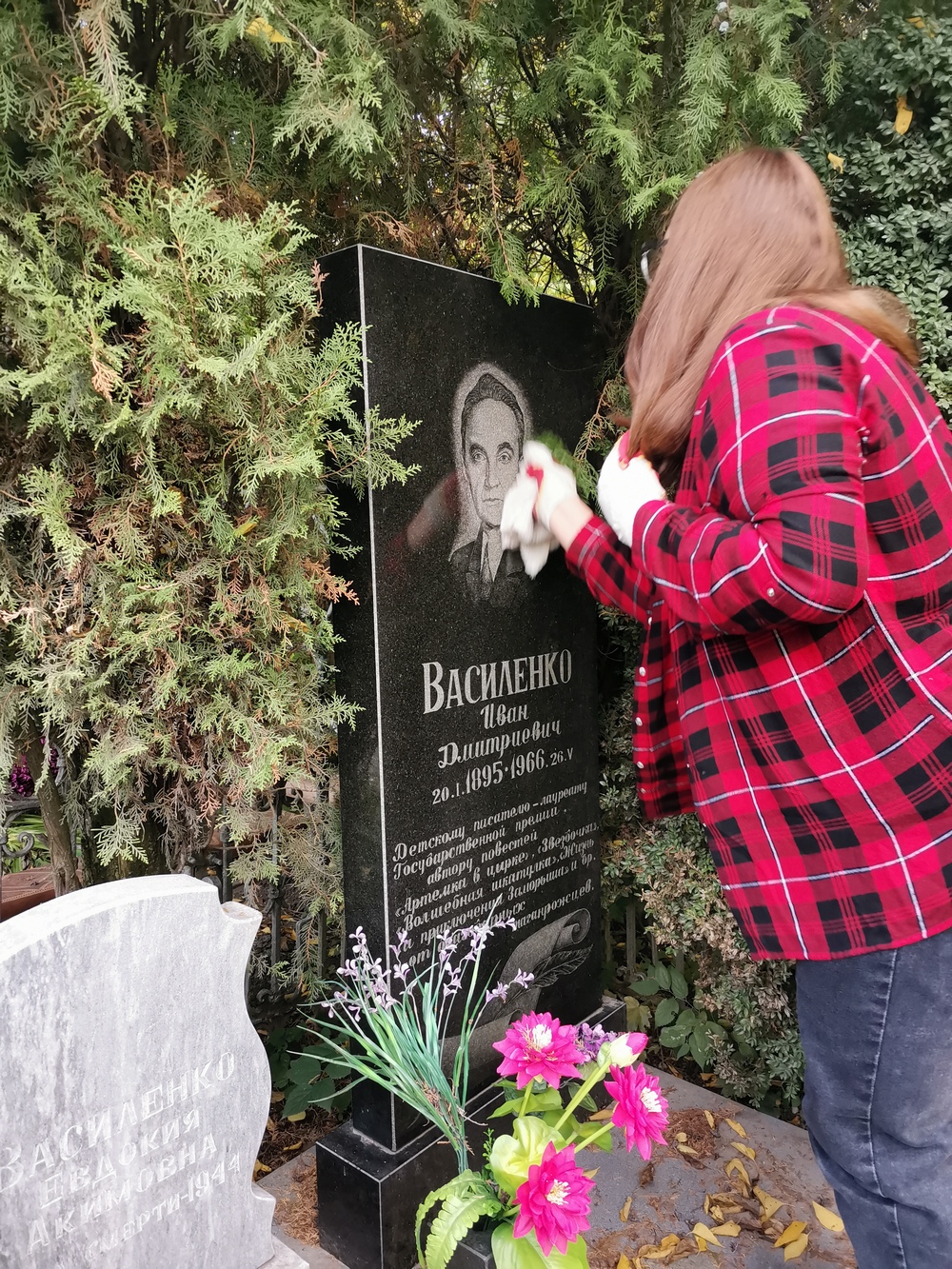У коллектива обучающихся и педагогов Таганрогского филиала ГКОУ РО «Ростовская-на-Дону санаторная школа-интернат № 74» к имени детского писателя И.Д.Василенко отношение особое. Именно в нашей школе был создан первый музей Василенко, частым гостем в школе был его племянник Борис Александрович Кадыков. Ребята читают произведения нашего земляка, ежегодно в школе проходит неделя, посвященная творчеству И.Д.Василенко. Традиционным стало шефство над могилой писателя. Каждый год группа волонтеров приводит могилу в порядок: делает обрезку кустарника, моет гранитную плитку памятника, выносит мусор. В этом году воспитанники 2 отряда убрали не только могилу писателя, но и поработали у обелиска советским воинам, который был неухожен и разрисован вандалами. Наш труд – это лишь небольшая дань уважения к людям, чей ратный и трудовой подвиг останутся в нашей памяти и в наших сердцах навсегда.