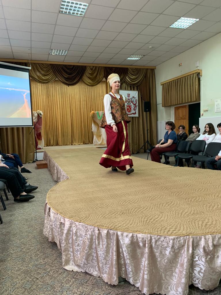 На школьном подиуме был продемонстрирован общешкольный проект «Есть в русской женщине Божественная сила, она прекрасна, как сама Россия» - 2 этап.