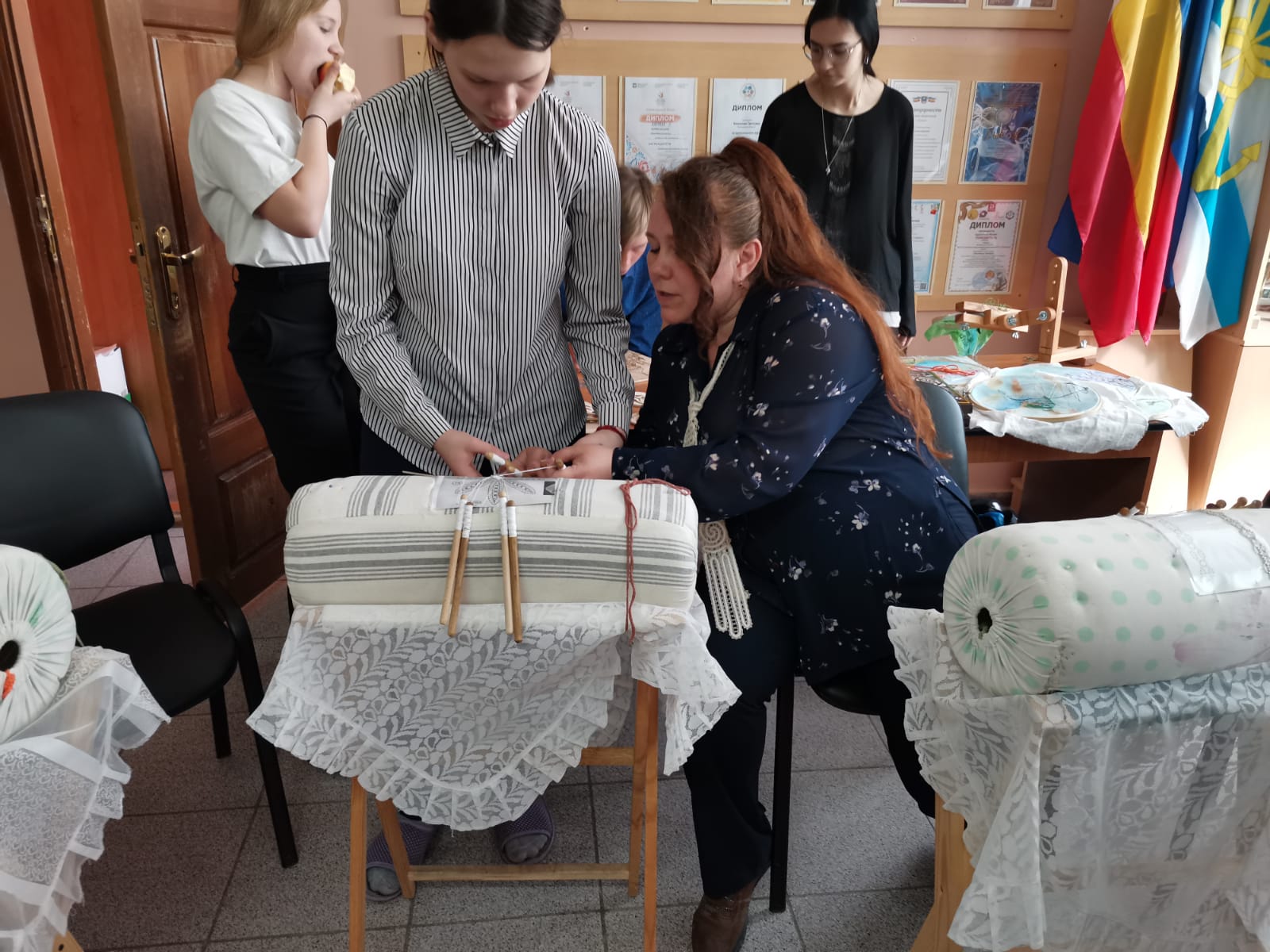 26.04. На переменах в школе педагог дополнительного образования Сазоненко Елена Александровна провела мастер класс по кружевоплетению. На предметной неделе нашего методического объединения стало традицией проводить мастер классы по разным видам прикладного искусства.