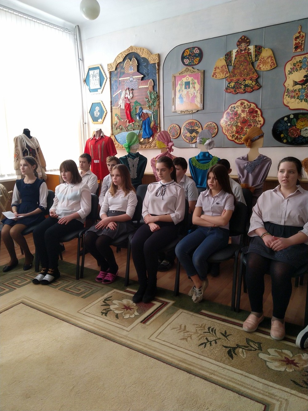 02 апреля 2019 года в ГКОУ РО «Таганрогская санаторная школа-интернат» на базе школьного Музея Живописи и народных промыслов классным руководителем В.Н. Мойсеенко был проведён классный час «Казачество на Дону: традиции и быт». В ходе мероприятия обучающиеся 5 класса познакомились с предметами казачьего быта, одежды и ремёсел. В конце классного часа была проведена интересная викторина о казачестве на Дону.
