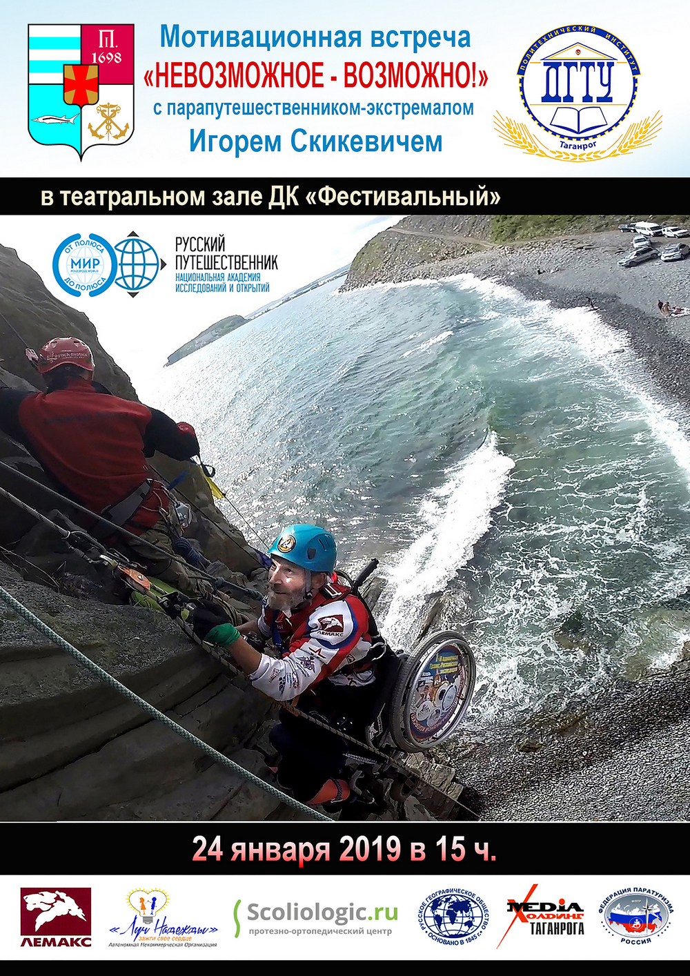 24.01.2019 года в 15:00 в театральном зале ДК «Фестивальный» города Таганрога состоялась мотивационная встреча «НЕВОЗМОЖНОЕ - ВОЗМОЖНО» учащихся 9 класса ГКОУ РО «Таганрогская санаторная школа - интернат» с вице-президентом Национальной Академии исследований и открытий «Русский путешественник», основателем Федерации паратуризма России Игорем Скикевичем. Целью встречи было воспитание у молодежи целеустремленности, настойчивости, подлинного мужества в борьбе за жизнь на ярком примере судьбы Игоря Скикевича. На встрече говорили о том, что судьба - не приговор, что человек - не сумма обстоятельств, а решения и поступки очень часто - наперекор судьбе.