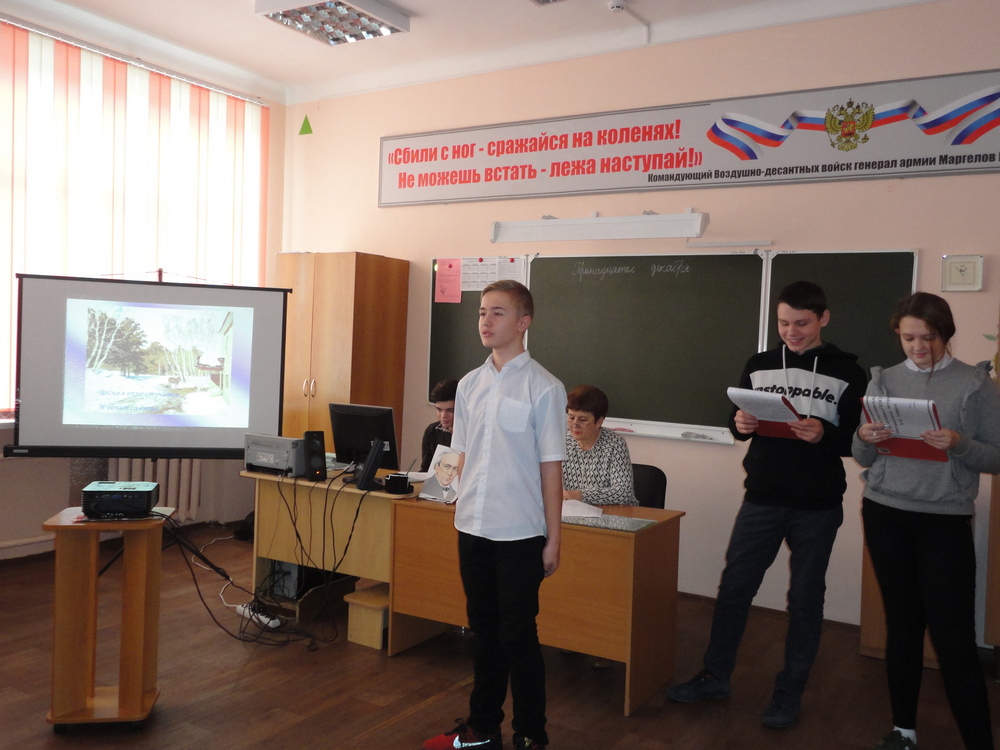 В рамках внеурочной деятельности 13 декабря 2018 года в ГКОУ РО «Таганрогская санаторная школа-интернат» с учащимися 8 классов был проведён литературный вечер «Одухотворённая природа», посвящённый 215-летию со дня рождения Ф.И.Тютчева. Дети читали стихотворения Фёдора Ивановича Тютчева о природе, смотрели презентацию о жизни и творчестве поэта.