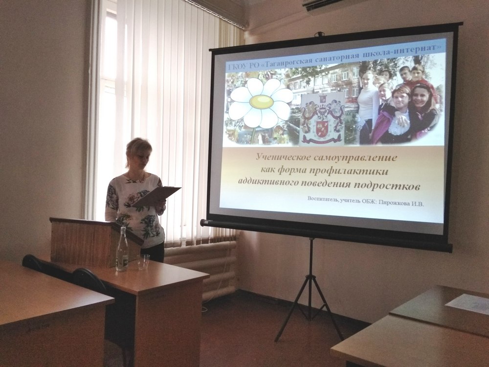 20 октября 2018 года в городе Таганроге на базе Таганрогского института имени А.П. Чехова (филиал) ФГБОУ ВО «РГЭУ (РИНХ)» состоялась II Региональная научно-практическая конференция «Актуальные проблемы профилактики аддиктивного поведения». В работе конференции приняли участие педагоги ГКОУ РО «Таганрогская санаторная школа-интернат» Пирожкова И.В. и Журавлева Ю.А., выступившие с докладами на секционных заседаниях.