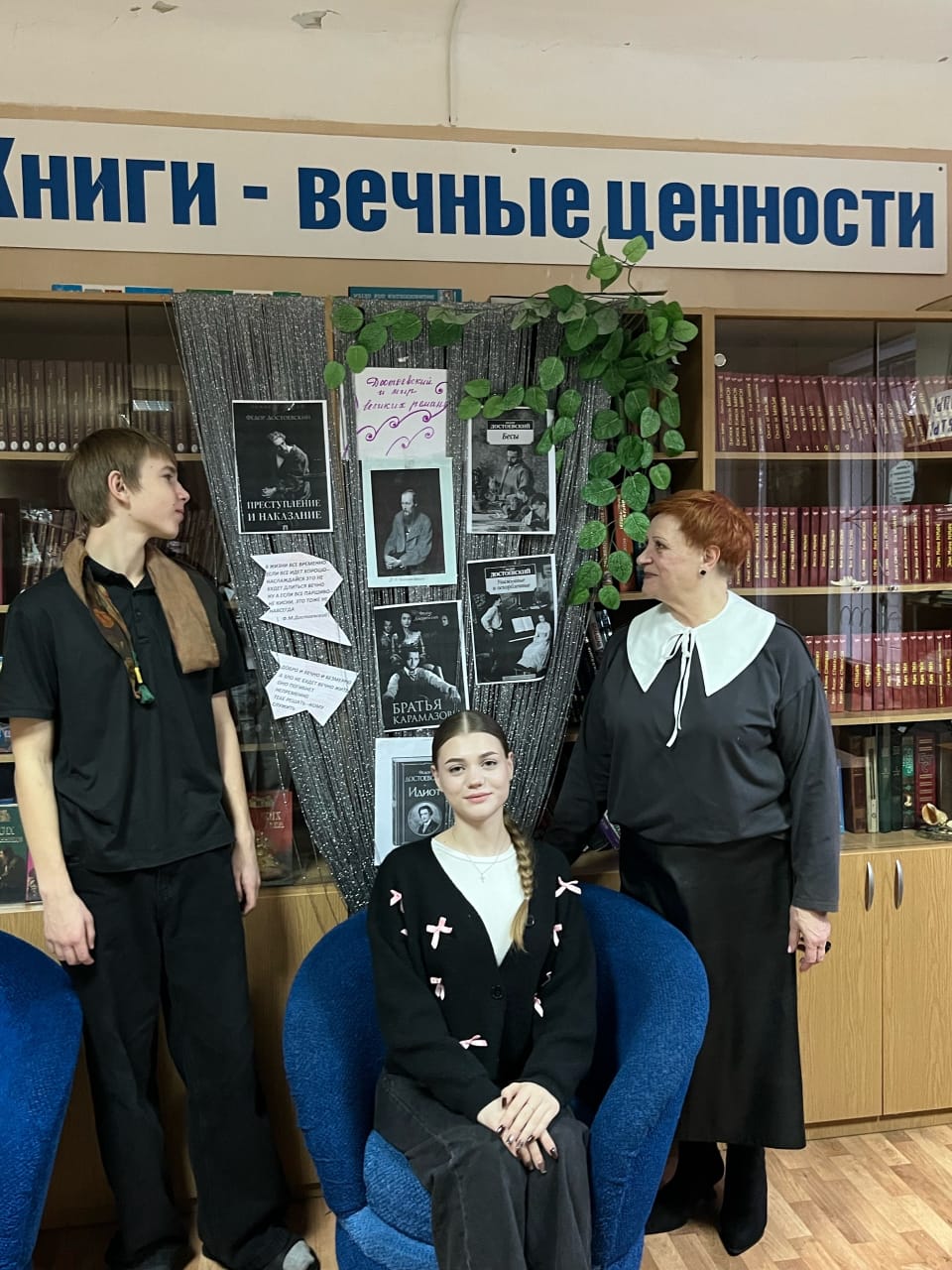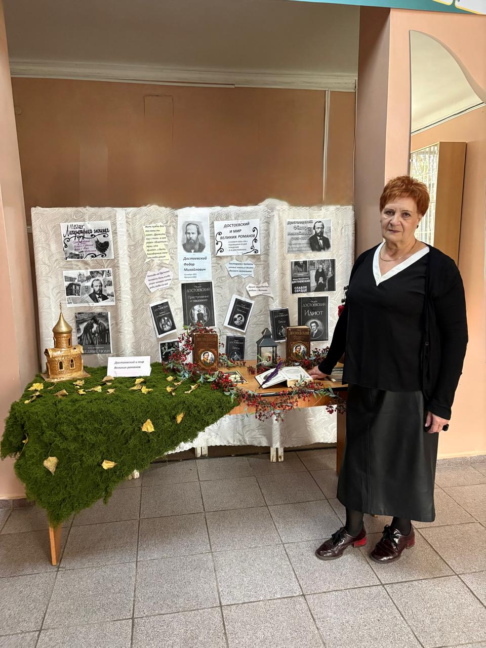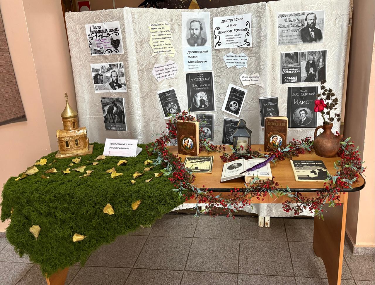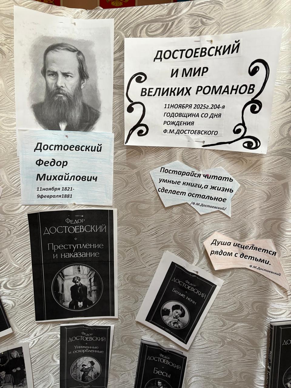 В канун дня рождения Ф.М. Достоевского библиотекарь Дудка С.Ю. совместно с активом школьной библиотеки оформили выставку книг великого русского писателя. На выставке были размещены книги автора, с которыми можно познакомиться в школьной библиотеке. В оформлении были использовать также элементы осенних мотивов 11 ноября ребята пригласили всех желающих принять участие в литературной гостиной «Достоевский и мир великих романов», которая пройдет в уютном читальном зале школьной библиотеки.