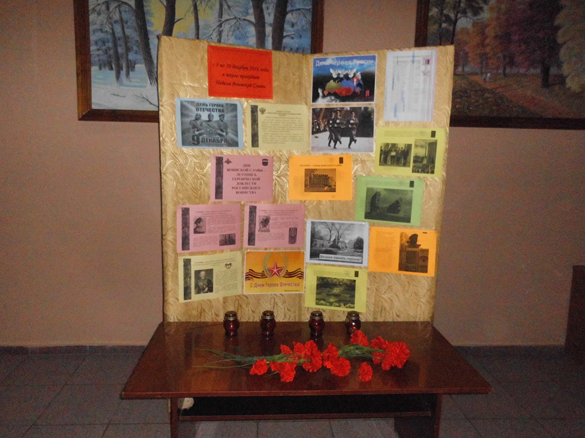 9 декабря 2016 года в ГКОУ РО «Таганрогская санаторная школа-интернат» прошел общешкольный урок, посвященный Дню Героев России. В ходе урока ребята узнали об истории возникновения памятной даты, почтили минутой молчания память погибших героев, выполнявших воинский долг. Завершением урока стал просмотр героической киноленты «Офицеры».