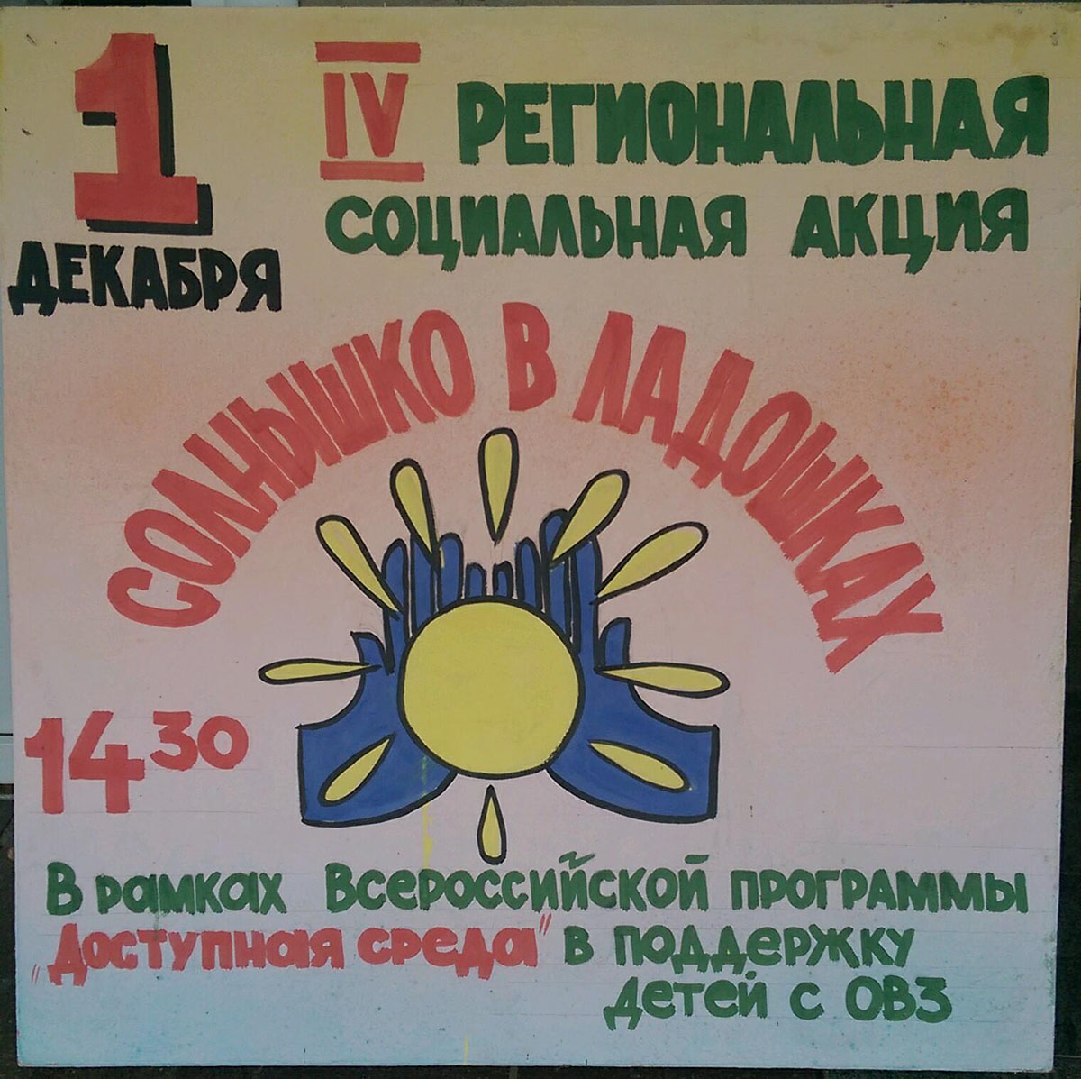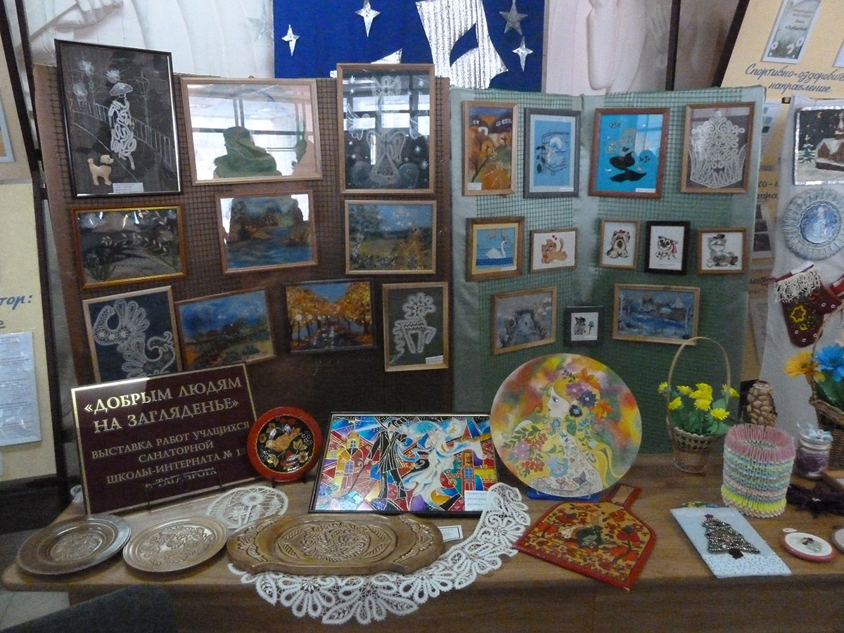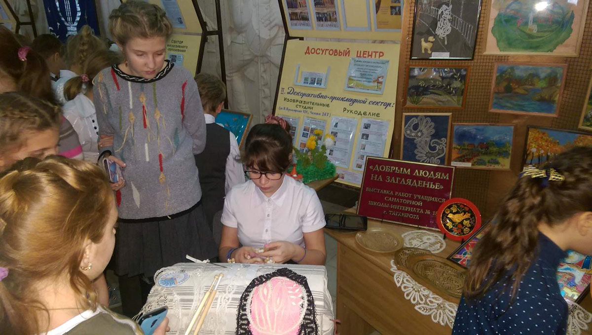 1 декабря 2016 года в Таганроге прошла IV региональная социальная акция «Солнышко в ладошках» в рамках Всероссийской программы «Доступная среда» в поддержку детей с ОВЗ. Впервые в акции приняли участие творческие коллективы ГКОУ РО «Таганрогская санаторная школа-интернат». В концертной программе выступили танцевальный ансамбль «Жемчужина» (руководитель Митасова М.И.) и вокальный ансамбль (руководитель Апанасенко А.П.). Педагоги дополнительного образования Сазоненко Е.А. и Галустян С.Н. представили выставку детского декоративно-прикладного творчества. Ученица 7 класса Сысоева Алена провела мастер-класс по кружевоплетению для всех участников акции.