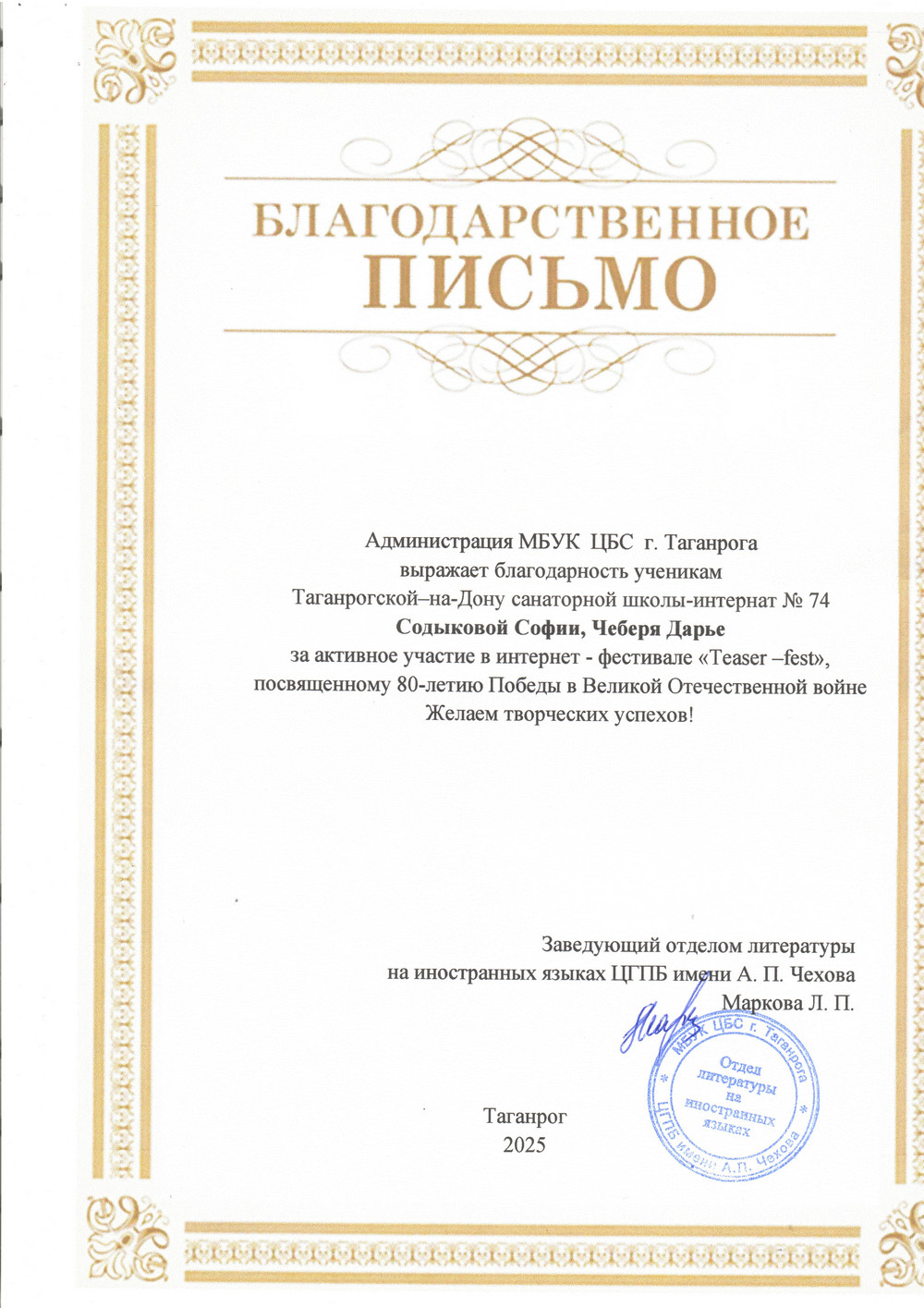 Во всех мероприятиях приняли участие обучающиеся 5 – 11 классов, творческие объединения школы, коллектив педагогов и сотрудников Таганрогского филиала, родители, Попечительский совет и представители Общественных организаций.