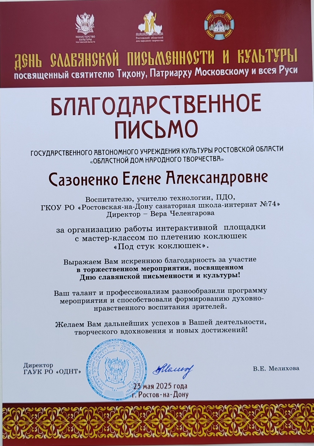 23 мая 2025 года в Ростовском академическом театре драмы имени М. Горького состоялся торжественный концерт, приуроченный к 100-летию со дня кончины Святейшего Патриарха Тихона, а также ко Дню славянской письменности и культуры. Мероприятие прошло при содействии Министерства культуры Ростовской области, Ростовской-на-Дону епархии в лице Епархиального отдела по взаимоотношениям Церкви с обществом и СМИ, Президентского фонда культурных инициатив, Патриаршего международного фестиваля «Свет Христов», фонда содействия развитию музыкального искусства «Академия хоровой культуры», а также Церковно-общественного совета при Святейшем Патриархе Московском и всея Руси по развитию русского церковного пения. Мероприятие сопровождалось художественными и декоративно-прикладными выставками, театрально-литературными площадками, посвященными Кириллу и Мефодию, интерактивными выставками в холлах театра, в том числе передвижной выставкой, посвященной святителю Тихону, а также видеоэкскурсией, отражающей его жизненный путь.