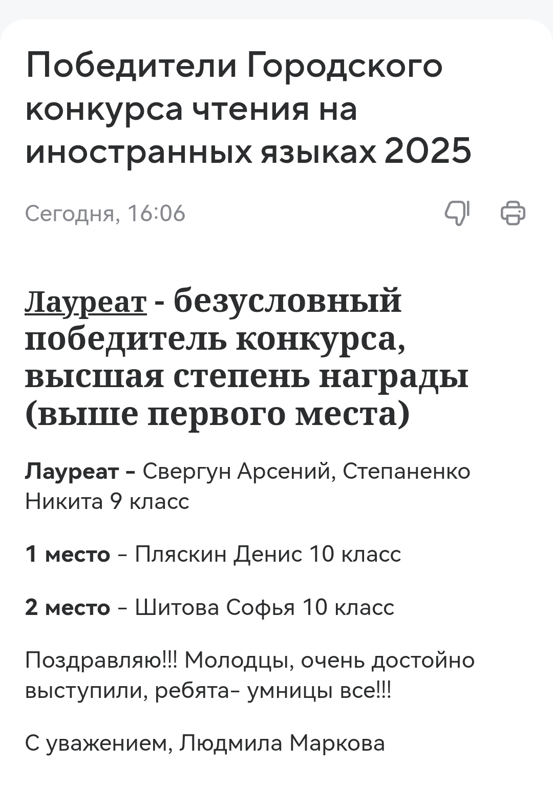 20 марта 2025 года в Таганроге прошел Городской конкурс чтения на иностранных языках. Традиционно наша школа принимает участие в этом конкурсе и этот год не стал исключением. Очень порадовали нас ученики 9 класса Арсений Свергун и Никита Степаненко, которые стали Лауреатами конкурса. А ученики 10 класса Пляскин Денис и Шитова Софья заняли первое и второе место соответственно. Поздравляем! Надеемся на дальнейшие успехи!